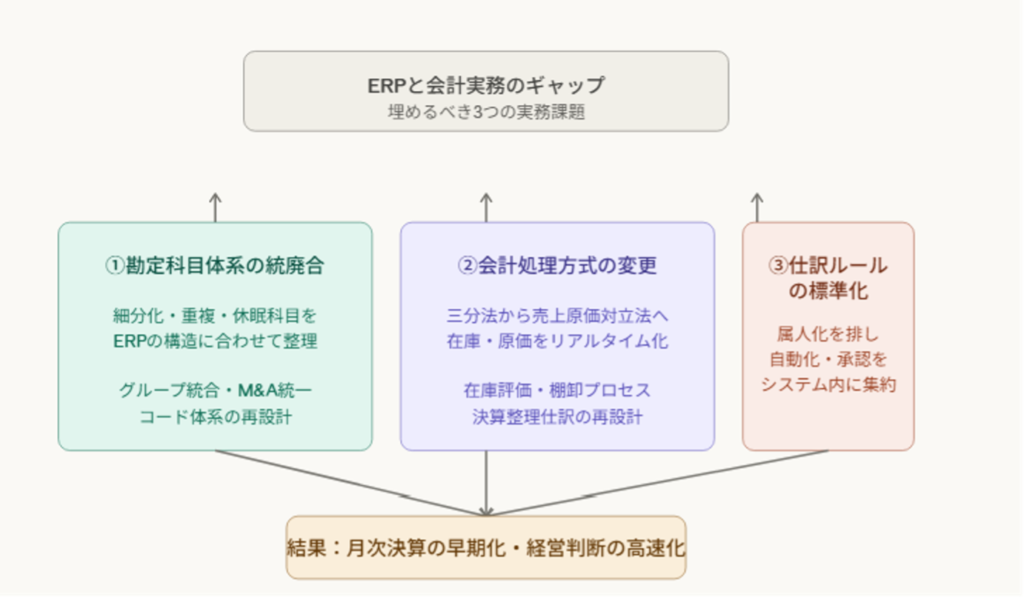 ERPと会計実務のギャップを埋めるために取り組むべき実務課題は、次の3つに集約されます。