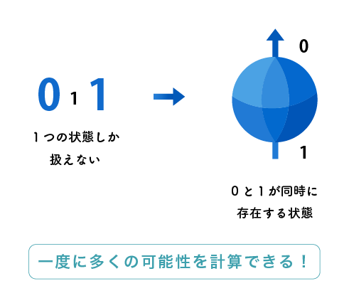 従来のコンピュータが「0」か「1」のいずれかで情報を処理するのに対し、量子コンピュータは「0」と「1」が同時に存在する“重ね合わせ”という状態を扱うことができます。