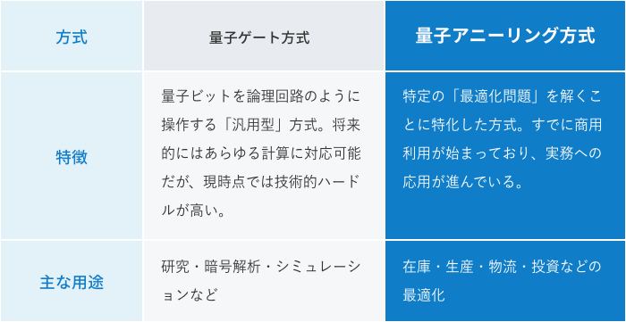 代表的なのが、汎用性の高い「量子ゲート方式」と、 特定の最適化課題を高速に解く「量子アニーリング方式」です。