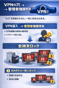 リモートワークや拠点間通信の手段としてVPNを導入している企業の場合、VPN機器が標的になってしまいます。