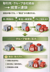 取引先からは「セキュリティ管理体制が不十分」として取引停止を通告され、事業継続の危機に直面するなど、被害額が大きくなるパターンです。