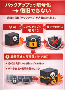 バックアップ環境という「虎の子」も人質にとられてしまうことで、実質的な解決策がなくなるパターンです。