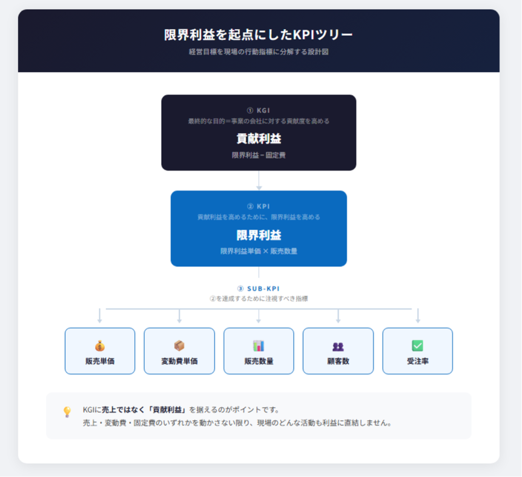 頂点に「貢献利益」を置き、その下に「限界利益」、さらにその下に現場がコントロールできる5つの行動指標(Sub-KPI)を配置します。