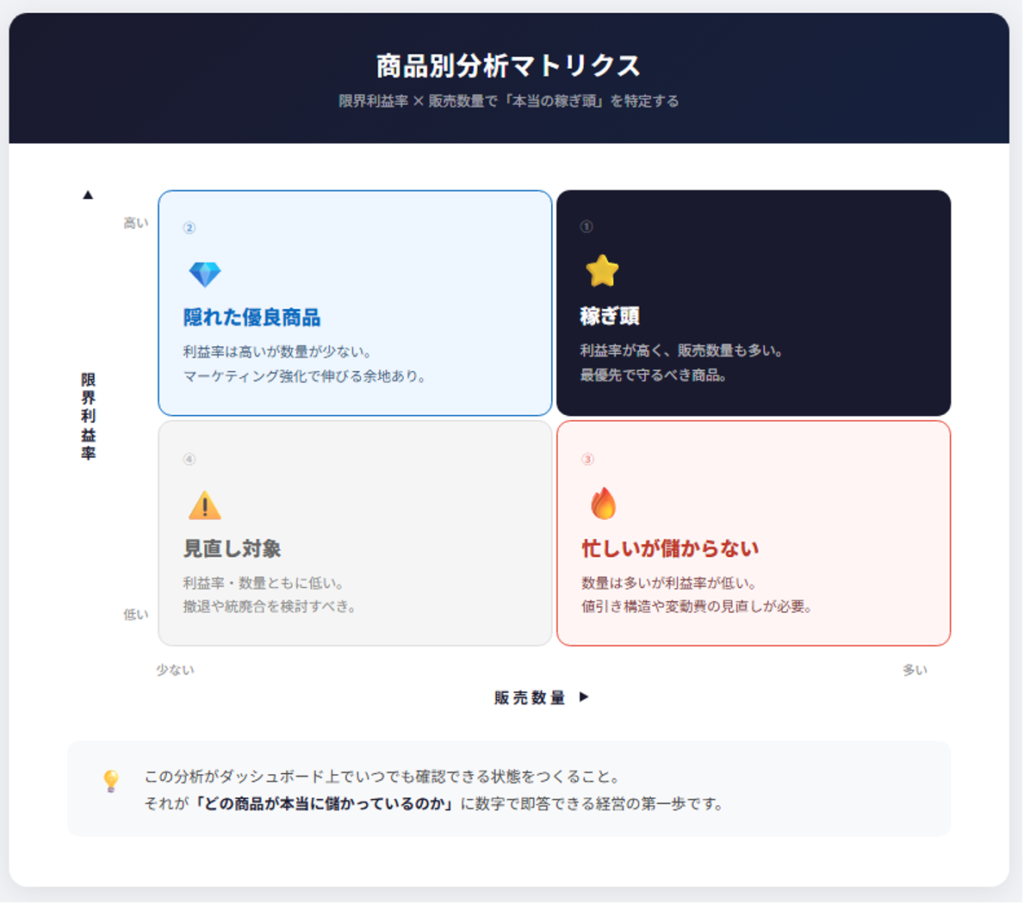 - 数量は多いが、利益率が低い → 「忙しいが儲からない商品」。値引き構造や変動費の見直しが必要です。